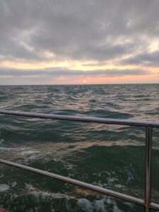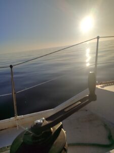 In der Nacht von Dienstag auf Mittwoch dreht der Wind leider immer mehr auf unsere Kurslinie.wir Segel am Wind, müssen aber die Maschine mitlaufen lassen um nicht zu langsam zu werden.