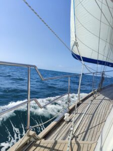 Der Motor der „Aaris“ ein Mercedes OM 616 mit 72 PS, macht seine Sache aber gut. Eben Technik aus den 1980’er. Den restlichen Montag haben wir tolles Segelwetter bei nicht allzu großer Dünung.
