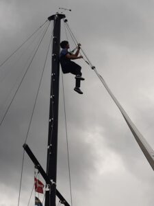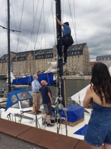 Ok, ich brauche jemanden mit Technischen Verständnis im Mast. Glück muss man haben! Hinter uns liegt eine Argentinische Familie, der Sohn ist Ingenieur, Clever und Fit. Er löst sehr schnell das Problem mit der vorstehenden Schraube, sodass ich das Segel bergen kann.