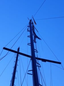 Ich sitze auf meinen Achterdeck und sehe das meine Fahne am Besanmast sich am Masttop verheddert hat.
